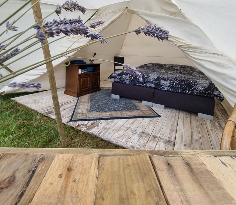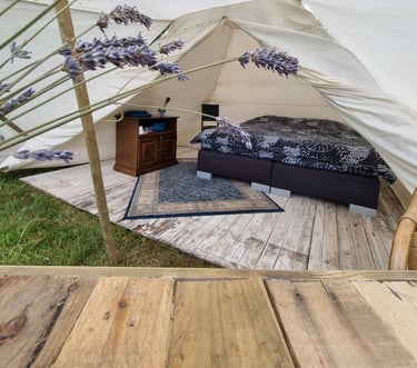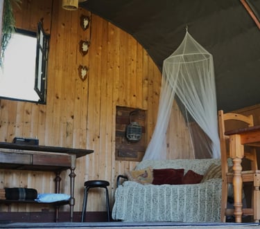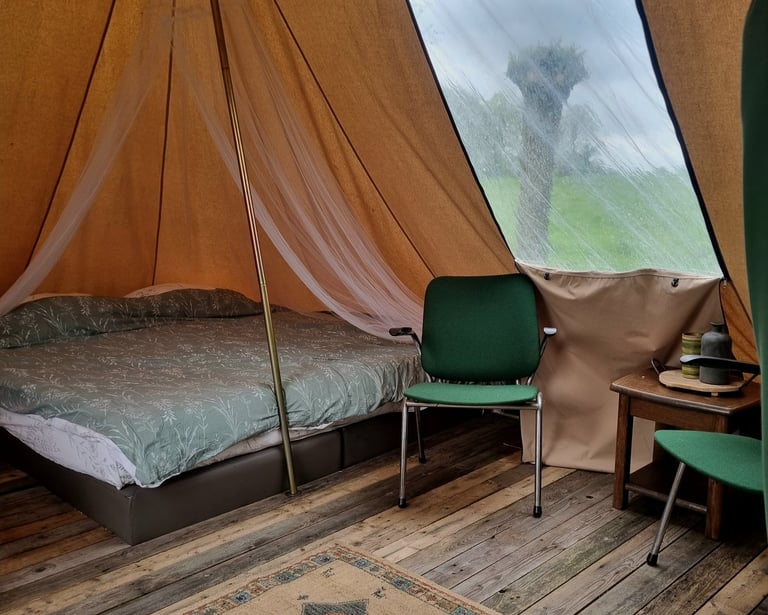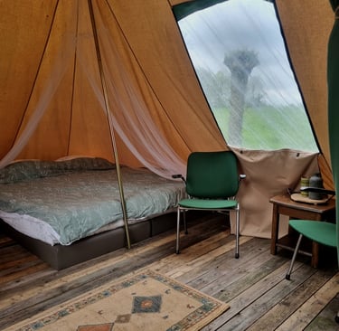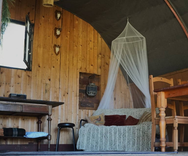 Een uniek piramide ontwerp met luifel, en nu staat deze helemaal ingericht en al voor jullie klaar!