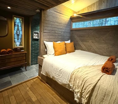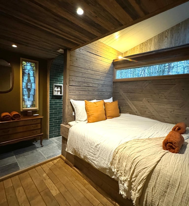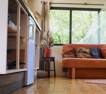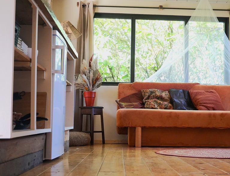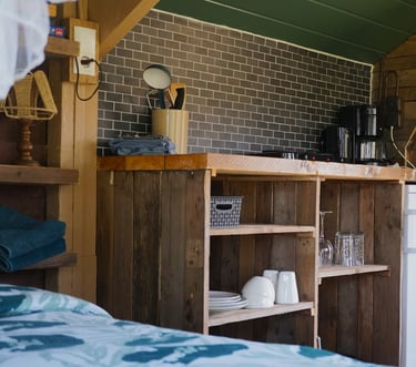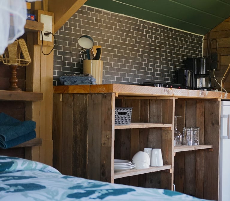Dit huisje is een warm toevluchtsoord. Met natuurlijke tweedehands materialen, zachte tinten en een rustige inrichting ademt het ruimte en eenvoud. De houten vlonder nodigt uit tot lange middagen in de zon, terwijl binnen alles klopt. Waar de tijd even stilstraat, en jij gewoon helemaal hier bent.