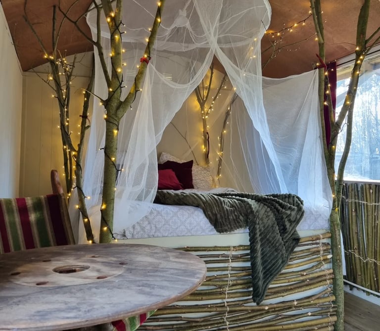 Deze pipowagen hebben wij omgetoverd tot een romantisch verblijf voor twee personen. Met hergebruikte materialen is deze leuke pipo wagen aangekleed. Een romantisch hemelbed voor 2 personen en een tafeltje en 2 stoeltjes van de kringloop.